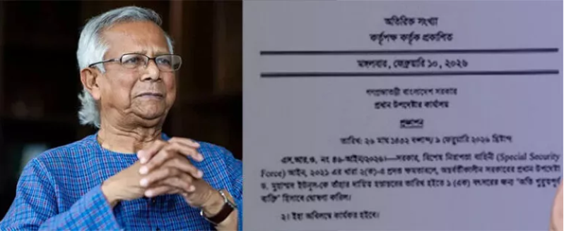 ক্ষমতা হস্তান্তরের ঠিক একদিন আগে রাষ্ট্রীয় অতিথি ভবন ‘যমুনা’ থেকে একজন বিশ্বস্ত অফিসার গেলেন বিজি প্রেসে। একটি বিশেষ আদেশ হাতে হাতে প্রিন্ট করে একটি মাত্র কপি নিয়ে আসেন। কী ছিল সেই অতি গোপনীয় গেজেটে? আর কেনই বা এটা নিয়ে এতো রাখঢাক? বাংলাদেশের অন্তর্বর্তী সরকারের প্রধান উপদেষ্টা নোবেলজয়ী অর্থনীতিবিদ ড. মুহাম্মদ ইউনূস দায়িত্ব ছাড়ার ঠিক আগে নিজেকে এক বছরের জন্য ঘোষণা করলেন অতি গুরুত্বপূর্ণ ব্যক্তি ভিভিআইপি। ওই গেজেটে বলা হয়েছে, বিশেষ নিরাপত্তা বাহিনী আইন ২০২১-য়ের ধারা ২ (ক) অনুযায়ী এই মর্যাদা দেওয়া হয়েছে। এর ফলে তিনি এক বছরের জন্য স্পেশ্যাল সিকিউরিটি ফোর্স এসএসএফের নিরাপত্তা পাবেন। গেজেটটি জারি করেন, তৎকালী প্রধান উপদেষ্টার কার্যালয়ের সচিব মো. সাইফুল্লা পান্না। বর্তমানে তিনি জনপ্রশাসন মন্ত্রণালয়ে রয়েছেন। এ বিষয়ে জানতে বিভিন্ন সংবাদমাধ্যমের দফতর থেকে ফোন করা হয়েছিল। তিনি ফোন ধরেননি।