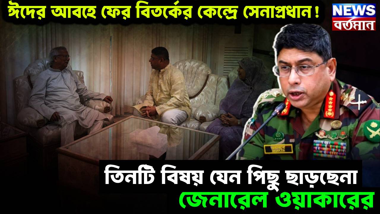 ঈদকে কেন্দ্র করে ফের আলোচনায় সেনাপ্রধান। সেই আলোচনায় সেনা প্রধানকে কেন্দ্র করে উঠে এসেছে তিনটি বিষয়। প্রথমত ঈদ উপলক্ষে সেনাপ্রধানের বক্তব্য, যা নিয়ে সৃষ্টি হয়েছে নানা রকম জল্পনা। এরপর সেনাপ্রধান সাক্ষাৎ করেছেন সে দেশের রাষ্ট্রপতি ও স্বয়ং প্রধান উপদেষ্টা মোঃ ইউনুসের সঙ্গে, এই ঘটনার পরেও বিভিন্ন প্রেক্ষাপটে ভিন্ন ভিন্ন আলোচনাও শুরু হয়েছে। আবার সদ্য জাতির উদ্দেশ্য ভাষণে প্রধান উপদেষ্টা যে বক্তব্য রেখেছেন তাতে স্পষ্ট হয়েছে আগামী বছর এপ্রিলের প্রথমার্ধে দেশে নির্বাচন অনুষ্ঠিত হবে। সেখানে প্রধান উপদেষ্টা সেনাপ্রধানের বিরুদ্ধে মতামত প্রকাশ করেছে তা নিয়ে শুরু হয়েছে বিতর্ক। তবে এই মুহূর্তে রাষ্ট্রপতি ও প্রধান ও প্রচেষ্টার সঙ্গে সেনাপ্রধানের সাক্ষাৎটিকে রাজনৈতিক দিক থেকে ব্যাখ্যা করার চেষ্টা করছেন অনেকেই।