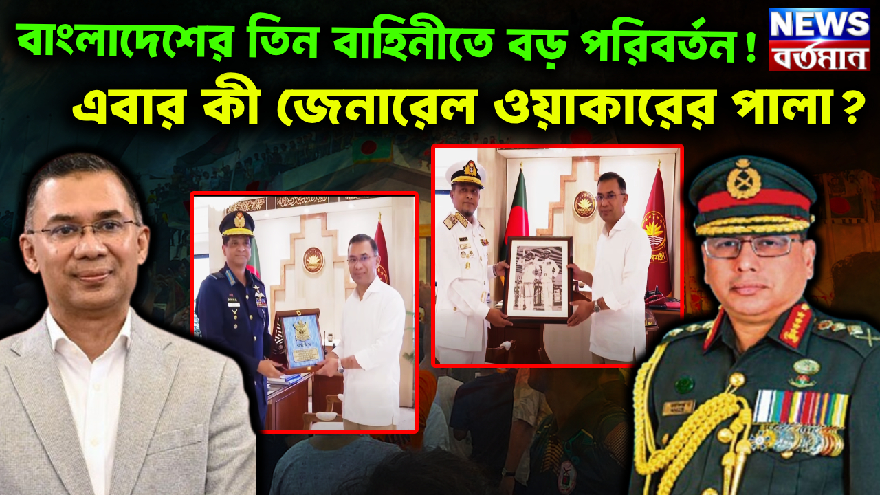 এর উত্তর খোঁজার আগে আমরা বরং একটু ফিরে যাই ফ্ল্যাসব্যাকে। ২০২৪ সালের ৫ আগস্ট বাংলাদেশ রাজনৈতিক পালা বদল ঘটে গিয়েছে। তৎকালীন প্রধানমন্ত্রী শেখ হাসিনা দেশ ছেড়ে ভারতে পালিয়ে গিয়েছিলেন। সেদিন সন্ধ্যায় বাংলাদেশের সেনাপ্রধান জেনারেল ওয়াকার উজ জামান জাতির উদ্দেশ্যে ভাষণ দেন। তখন তাঁর দুই পাশে উপস্থিত ছিলেন নৌ ও বিমানবাহিনীর প্রধানরা। সেদিন জেনারেল ওয়াকার বলেছিলেন আজ থেকে বাংলাদেশের সমস্ত জনগণের জান মালের দায়িত্ব তার কাঁধে। এরপর বাংলাদেশের রাষ্ট্রপতি মোহাম্মদ শাহাবুদ্দিন যখন জাতির উদ্দেশ্যে ভাষণ দিলেন তখনও তাঁর পিছনে দাঁড়িয়ে ছিলেন বাংলাদেশের তিন বাহিনীর প্রধান। এরপর থেকে বিগত দেড় বছরে মুহাম্মদ ইউনূসের অন্তর্বর্তীকালীন সরকারের জমানায় যতবারই এই পরিস্থিতির সামনে এসেছে ততবারই আমরা দেখেছি বাংলাদেশ সেনাবাহিনী প্রধান জেনারেল ওয়াকার-উজ-জামান, নৌবাহিনী প্রধান অ্যাডমিরাল মোহাম্মদ নাজমুল হাসান ও বিমানবাহিনী প্রধান এয়ার চিফ মার্শাল হাসান মাহমুদ খাঁন একসাথে প্রকাশ্যে এসেছেন। এমনকি তারেক রহমান বাংলাদেশের নতুন প্রধানমন্ত্রী হিসেবে দায়িত্ব নেওয়ার পর তাঁর সঙ্গে সৌজন্য সাক্ষাৎ করতে এই তিনজন একসাথেই গিয়েছিলেন। সেটা ছিল ১৯ তারিখ। কিন্তু তাল কাটলো দুদিন পরেই। প্রধানমন্ত্রী তারেক রহমান আলাদা আলাদা করে বৈঠক করলেন বাংলাদেশ নৌ বাহিনী প্রধান অ্যাডমিরাল মোহাম্মদ নাজমুল হাসান এবং বিমানবাহিনী প্রধান এয়ার চিফ মার্শাল হাসান মাহমুদ খাঁনের সঙ্গে। তাৎপর্যপূর্ণভাবে বাদ গেলেন বাংলাদেশের সেনাপ্রধান জেনারেল ওয়াকার উজ জামান। এই ঘটনা রাজনৈতিক ওয়াকিবহাল মহলে যথেষ্ট শোরগোল ফেলেছে।