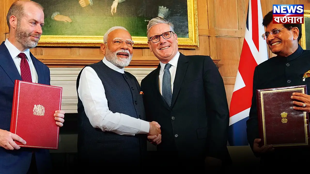 মার্কিন যুক্তরাষ্ট্রকে বুড়ো আঙ্গুল দেখিয়ে ব্রিটেনের সঙ্গে বড় বাণিজ্য চুক্তি সেরে ফেলল ভারত। সেই সঙ্গে বাংলাদেশকে স্পষ্ট বার্তা দিল যে ভারত এই মুহূর্তে বিশ্ব রাজনীতিতে অনেক বড় শক্তি। দীর্ঘদিন ধরেই ভারতের সঙ্গে বাণিজ্য চুক্তি নিয়ে বিভিন্ন দাবি করে আসছেন মার্কিন প্রেসিডেন্ট ডোনাল্ড ট্রাম্প। কিন্তু ভারত নিজের শর্তে অনড়। এখন জানা যাচ্ছে, আপাতত মিনি বাণিজ্য চুক্তি হতে পারে ভারত ও মার্কিন যুক্তরাষ্ট্রের মধ্যে, কারণ এখনও সব বিষয়ে সমঝোতা হয়নি। এদিকে গ্রেট ব্রিটেনের সঙ্গে ভারতের মুক্ত বাণিজ্য চুক্তি হয়ে গেল। যার ফলে লাভবান হতে চলেছে ভারত। সবচেয়ে বড় ব্যাপার হল, ২০২০ সালে ইউরোপীয় ইউনিয়ন ছেড়ে বেরিয়ে আসার পর এটিই কোনও দেশের সঙ্গে ব্রিটেনের সবচেয়ে বড় বাণিজ্যিক চুক্তি। বছরে ৩,৪০০ কোটি ডলারের দ্বিপাক্ষিক বাণিজ্যের চুক্তি হয়েছে বলে যৌথ সাংবাদিক সম্মেলনে জানিয়ে দুই দেশের প্রধানমন্ত্রী। কেন এই বাণিজ্য চুক্তি গুরুত্বপূর্ণ, সেটা একবার জেনে রাখা প্রয়োজন। পাশাপাশি এই চুক্তি কি কি বলা আছে, সেটাও জেনে নেওয়া যাক।