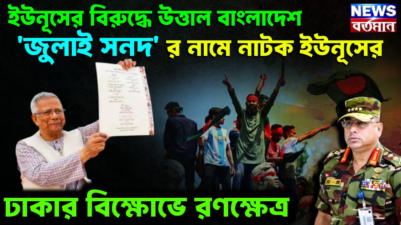 কোনও কিছুতেই আর মুহাম্মদ ইউনূসের মুখ রক্ষা হচ্ছে না। এইবার জুলাই সনদ সাক্ষর করতে গিয়ে মুখ পুড়ল তার। মুহাম্মদ ইউনূসের বিরুদ্ধে উত্তাল বাংলাদেশ। জুলাই সনদকে কেন্দ্র করে ইঁট ছোড়াছুড়ি থেকে লাঠিপেটা, বিক্ষোভ চলার পর দেখা গেল চেয়ার ফাঁকা। জুলাই সনদে সই করল না এনসিপি বা জাতীয় নাগরিক পার্টি। জুলাই সনদ সাক্ষরের পর তারই প্রতিবাদে ঢাকায় আক্রমণাত্বক বিক্ষোভ চলে জুলাই যোদ্ধা বলে দাবিদারদের। এদিকে অনেকে বলছেন ইউনূসের মূল উদ্দেশ্য একটাই, যতদিন সম্ভব বাংলাদেশে ক্ষমতায় টিকে থাকা। তার জন্য একের পর এক নাটক মঞ্চস্থ হচ্ছে ইউনূস সরকারের তরফে। সেই তালিকায় নতুন সংযোজন জুলাই সনদ স্বাক্ষর।