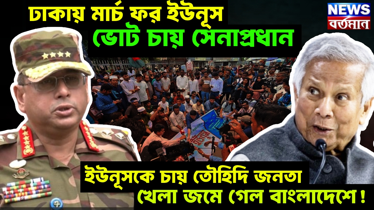 অর্থাৎ, বিনা যুদ্ধে ছাড়িব না সূচাগ্র মেদিনী। এমনই সিদ্ধান্ত নিয়েছেন মুহাম্মদ ইউনূস। উল্লেখ্য, এর আগে তিনি বৈঠক করেছেন, জাতীয় নাগরিক পার্টির নেতাদের সঙ্গে। সেখানেই মূলত সেনাপ্রধানের মোকাবিলা করার রূপরেখা তৈরি হয়ে যায় বলে মত বাংলাদেশের রাজনৈতিক বিশ্লেষকদের। শুক্রবার থেকেই রাস্তায় নেমে যাওয়ার পরিকল্পনা হয় সেনাপ্রধানের বিরুদ্ধে। সেই মতো ঢাকার শাহবাগে ‘মার্চ ফর ইউনূস’ নামে একটি বিক্ষোভ কর্মসূচি অনুষ্ঠিত হচ্ছে। এই কর্মসূচির মাধ্যমে অন্তর্বর্তীকালীন সরকারের প্রধান উপদেষ্টা মুহাম্মদ ইউনূসকে রাষ্ট্রপতি করার দাবিও তোলা হয়েছে। শনিবার বিক্ষোভকারীরা রাজধানী ঢাকার সর্বত্র ব্যানার ও পোস্টারে ছয়লাপ করে দিয়েছে। বিক্ষোভের মূল দাবি হল, মুহাম্মদ ইউনূসকে পাঁচ বছরের জন্য ক্ষমতায় রাখা এবং নির্বাচন আয়োজনের আগে প্রয়োজনীয় রাজনৈতিক ও সাংবিধানিক সংস্কার সম্পন্ন করা। বিক্ষোভকারীদের দাবি, বর্তমান পরিস্থিতিতে নির্বাচন আয়োজনের আগে সংস্কার করাটা অত্যন্ত জরুরি। ওয়াকিবহাল মহলের মতে, এটা আদতে জাতীয় নাগরিক পার্টির পরিকল্পনা। তাঁরা ধীরে ধীরে গত বছরের জুলাই আন্দোলনের ধাঁচে এবার সেনাপ্রধান জেনারেল ওয়াকারের বিরুদ্ধে গণ আন্দোলন গড়ে তুলতে চায়। অন্যদিকে নি্র্বাচন নিয়ে চাপ দিচ্ছে বিএনপি-সহ কয়েকটি রাজনৈতিক দলও। কিন্তু শনিবার এক দলীয় মজলিসে জামাতের আমীর শফিকুর রহমান যে বক্তব্য রেখেছেন, তাতে রহস্য আরও ঘনিভূত হয়েছে। কারণ তিনি একদিকে যেমন সেনাবাহিনীর পাশে দাঁড়ানোর আহ্বান জানিয়েছেন, তেমনই রাখাইন মানবিক করিডোর নিয়ে তদারকি সরকারের তাড়াহুড়ো করাটাও ভুল বলেছেন।