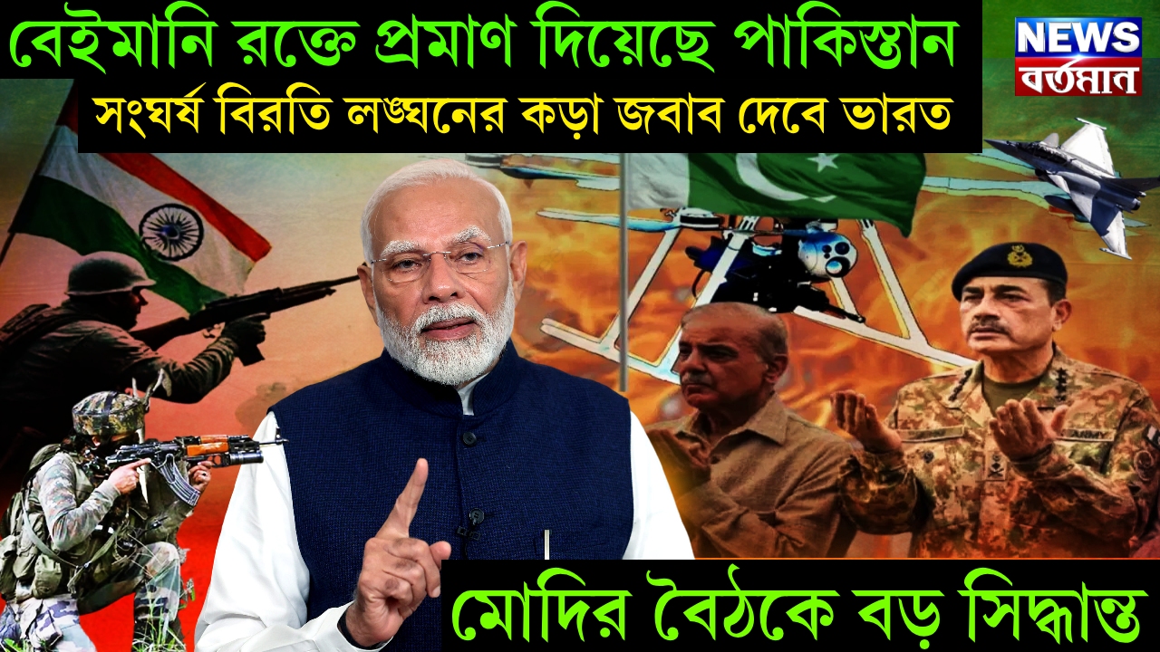 পাকিস্তান কি কোনও দিন শোধরাবে না? ডোনাল্ড ট্রাম্পের মধ্যস্থতায় সংঘর্ষবিরতির জন্য প্রতিশ্রুতি বদ্ধ হলেও, মাত্র তিন ঘণ্টায় তা লঙ্ঘন! আসলে জঙ্গীস্থান পাকিস্তান মানচিত্রে যতদিন থাকবে, ততদিন তাদের এই চরিত্র অব্যাহত থাকবে। তবে তার যোগ্য জবাব দিচ্ছে ভারত। শনিবার আচমকা আমেরিকার প্রেসিডেন্ট ডোনাল্ড ট্রাম্প দুই দেশের সংঘর্ষ বিরতির পোস্ট করেন। এমনকি ভারত ও পাকিস্তানকে অভিনন্দনও জানান তিনি। কিন্তু বাস্তবের মাটিতে দেখা গেল, পাকিস্তান রয়েছে পাকিস্তানেই। মাত্র তিন ঘণ্টার মধ্যে সীমান্ত থেকে গোলাগুলি চলতে থাকে পাকিস্তান থেকে। এমনকি ড্রোন হামলা চালানো হয়। যদিও ভারত চুপ থাকেনি। যোগ্য জবাব দিতে থাকে। এর মধ্যেই খবর ভারত পাকিস্তানের আলোচনায় বসার সম্ভাবনা। আর তার আগেই মেগা বৈঠক। ভারত পাকিস্তানের বৈঠকের আগেই ঘুঁটি সাজাতে শুরু করে দিলেন ভারতের প্রধানমন্ত্রী নরেন্দ্র মোদি। প্রধানমন্ত্রীর বাসভবনে বৈঠক। ফের তিন বাহিনীর সঙ্গে বৈঠক নরেন্দ্র মোদির। স্থল বায়ু নৌসেনা প্রধানের সঙ্গে বৈঠক প্রধানমন্ত্রীর। বৈঠকে CDS অনীল চৌহান, জাতীয় নিরাপত্তা উপদেষ্টা অজিত ডোভালও। দুই দেশ আলোচনা বসার আগে এই বৈঠক অত্যন্ত গুরুত্বপূর্ণ। রণকৌশল, রণনীতি সাজানো হয়েছে বলে খবর। আর এর পরই দেখা গেল তিন বাহিনীর যৌথ সংবাদিক বৈঠক। যেখানে উপস্থিত ছিলেন ভারতীয় সেনার ডিজিএমও। অপারেশন সিঁদুর নিয়ে স্পষ্ট করে দেওয়া হল ভারতের মূল লক্ষ্য।