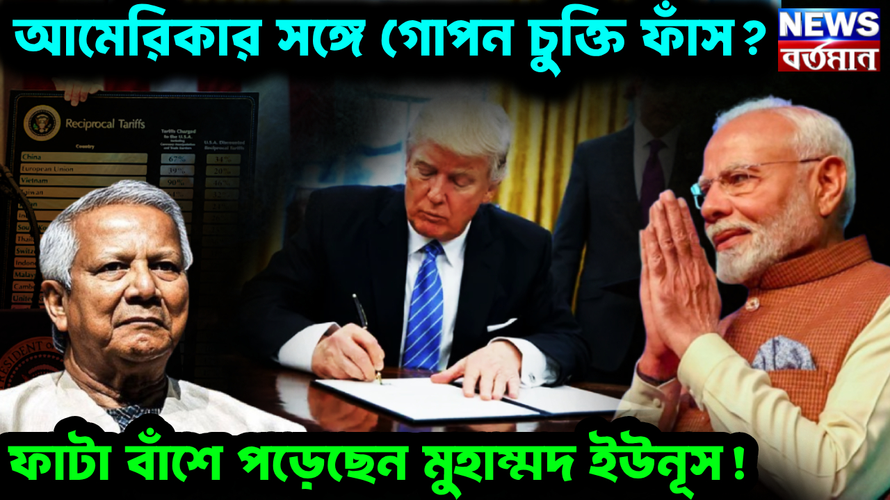 এক গভীর রাজনৈতিক ও অর্থনৈতিক ষড়যন্ত্রের মুখোমুখি দাঁড়িয়ে বাংলাদেশ। এমনটাই দাবি সে দেশের রাজনৈতিক ওয়াকিবহাল মহলের একাংশের। কিসের ষড়যন্ত্র, কার সঙ্গে ষড়যন্ত্র? উত্তরটা নাকি মার্কিন যুক্তরাষ্ট্র। আসলে মার্কিন যুক্তরাষ্ট্রের প্রেসিডেন্ট ডোনাল্ড ট্রাম্পের নির্দেশে ওয়াশিংটন বিশ্বের প্রায় সব দেশের সঙ্গেই শুল্ক নিয়ে আলোচনা চালাচ্ছে। সেই অনুযায়ী বাণিজ্য চুক্তিও হচ্ছে। ট্রাম্পের ঘোষণা অনুযায়ী যে দেশ শুল্কনীতি নিয়ে সমঝোতা করতে পারছে না, সেই দেশের পণ্যে মার্কিন যুক্তরাষ্ট্র একটা পাল্টা শুল্ক চাপাচ্ছে। যেমন বাংলাদেশের জন্য যুক্তরাষ্ট্র ধার্য করেছে ৩৫ শতাংশ পাল্টা শুল্ক। আগে বাংলাদেশি পণ্যে ১৫-১৭ শতাংশ শুল্ক বা ট্যারিফ ছিল মার্কিন যুক্তরাষ্ট্রের। ১ আগস্ট থেকে পূর্ব ঘোষণামতো এর ওপর বাড়তি ৩৫ শতাংশ ট্যারিফ যোগ হবে। সবমিলিয়ে মার্কিন যুক্তরাষ্ট্রে রফতানি হওয়া বাংলাদেশি পণ্যে ৫০ থেকে ৫২ শতাংশ পর্যন্ত শুল্ক যোগ হবে। এ সব পুরোনো কথা, এখন সবাই জানেন। নতুন কথা হল, বাংলাদেশ নাকি মার্কিন যুক্তরাষ্ট্রের সঙ্গে গোপন চুক্তি করেছে। যা নিয়ে এখন তোলপাড় হচ্ছে বাংলাদেশের রাজনীতি।