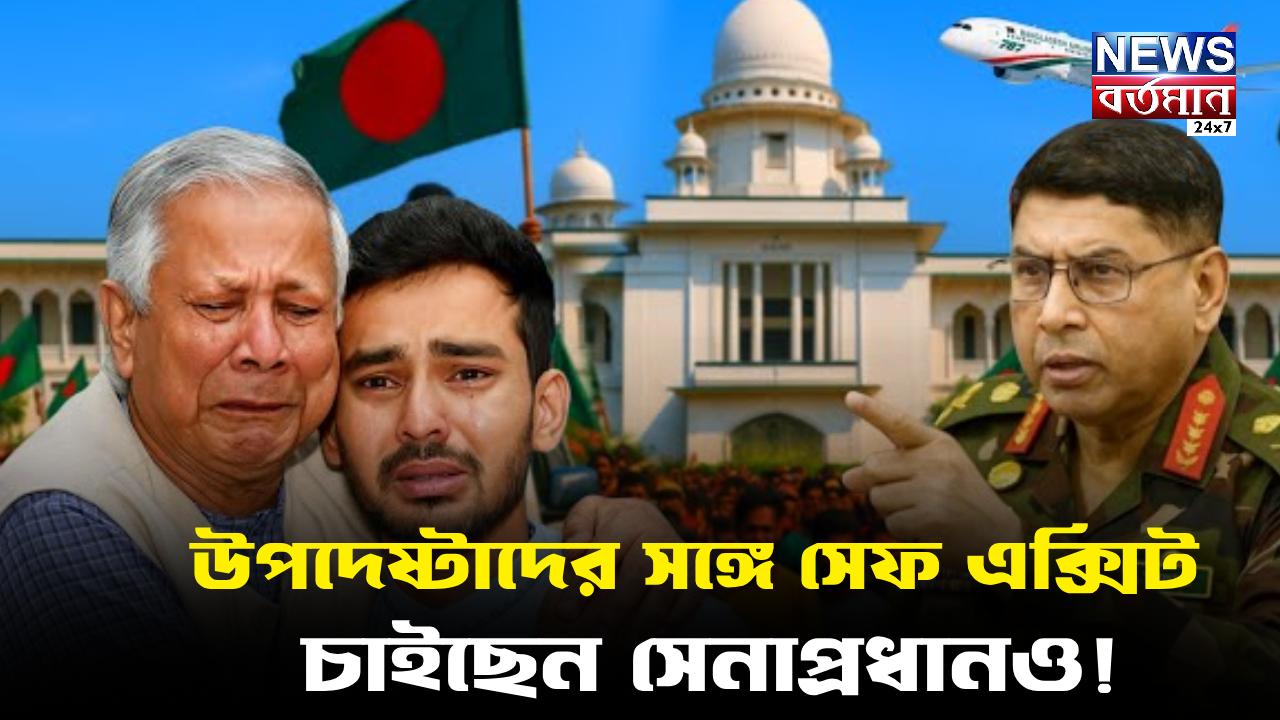 বাংলাদেশের রাজনৈতিক বিশ্লেষকরা দাবি করছেন, মুহাম্মদ ইউনূসের অন্তর্বর্তী সরকার একেবারেই ব্যর্থ। ফলে এই মুহূর্তে রাজনৈতিকভাবে তাঁরা প্রবল চাপে রয়েছেন। দেশে বিনিয়োগ নেই, আইন-শৃঙ্খলা রক্ষা করতেও তাঁরা ব্যর্থ হয়েছেন। নিত্যপ্রয়োজনীয় জিনিসপত্রের দাম নিয়ন্ত্রণে রাখতে পারেনি অন্তর্বর্তী সরকার। বাংলাদেশে সেভাবে বিদেশী বিনিয়োগ আসেনি। গত এক বছরে প্রায় ২০০ পোশাক কারখানা বন্ধ হয়েছে, লাখ লাখ মানুষ বেকার হয়েছেন। বাংলাদেশের প্রশাসনকেও যেমন নিয়ন্ত্রিণ করতে পারেনি ইউনূস সরকার, তেমনই মব নিয়ন্ত্রণ করতে পারেনি তাঁরা। সংখ্যালঘু সম্প্রদায়ের পাশাপাশি নারী ও শিশুর প্রতি সহিংসতা রোধেও ব্যর্থ মুহাম্মদ ইউনূস। তার কাছে আন্তর্জাতিক সমর্থনও প্রায় নেই বললে চলে। এর সঙ্গে যুক্ত হয়েছে পাহাড় প্রমান দুর্নীতির অভিযোগ। সবমিলিয়ে পরবর্তী নির্বাচিত সরকার এলে এই উপদেষ্টাদের কেউ ছাড়বে না। একইভাবে বাংলাদেশের সেনাপ্রধানও প্রবল চাপে আছেন। কারণ, গত বছর ৫ আগস্ট শেখ হাসিনার পতনের পর তিনি দাবি করেছিলেন বাংলাদেশের জনগণকে সবদিক থেকে রক্ষা করবেন। তা তিনি পুরণ করতে পারেননি। এক সময় বাংলাদেশের জনগণ তাঁকে রক্ষাকর্তা ভাবতেন, আজ তাঁর নাম শুনলেই বিরক্ত হন বাংলাদেশের মানুষ। জানা যাচ্ছে, তিনিও সেফ এক্সিট চাইছেন, তাঁর ভয় আওয়ামী লীগ ও নেত্রী শেখ হাসিনা।