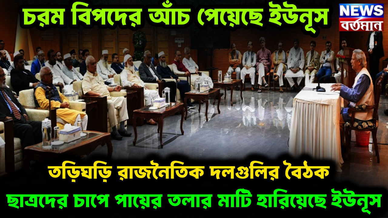 চরম বিপদের আঁচ পেয়েছে ইউনূস। তড়িঘড়ি রাজনৈতিক দলগুলির বৈঠক। ছাত্রদের চাপে পায়ের তলার মাটি হারিয়েছে ইউনূস