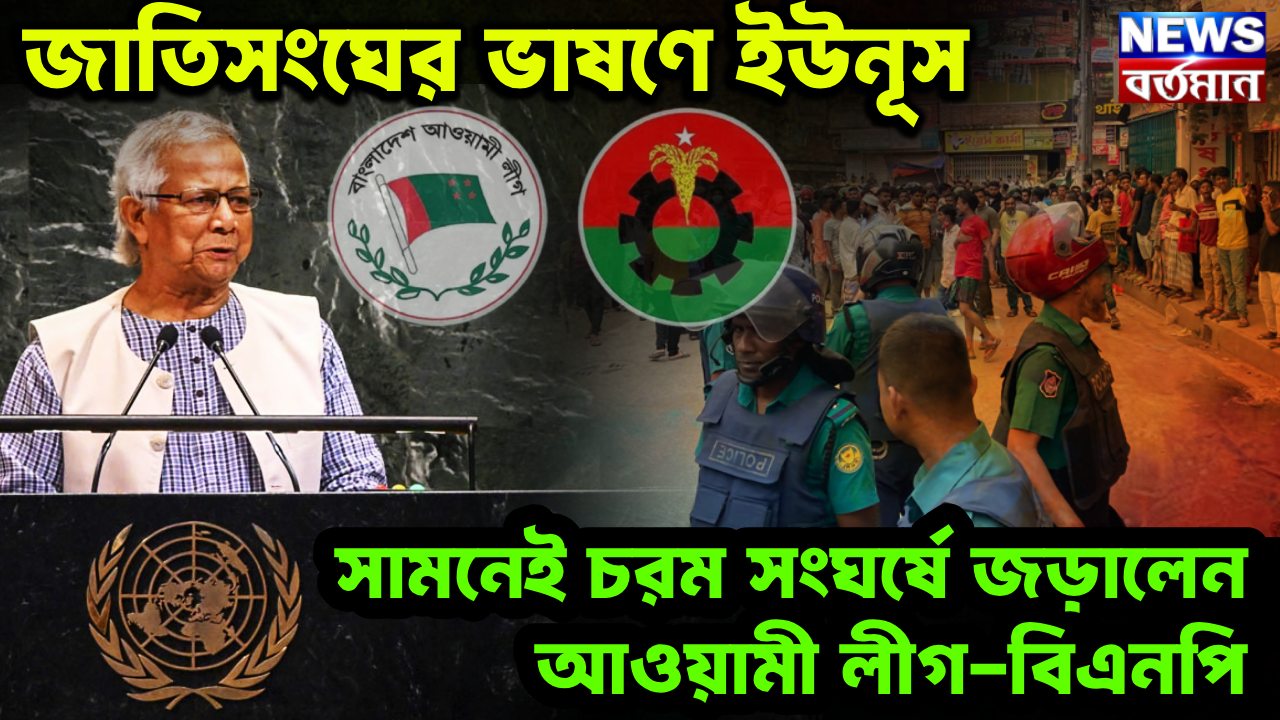 জাতিসংঘের সাধারণ পরিষদে ভাষণ দিলেন বাংলাদেশের অন্তর্বর্তীকালীন সরকারের প্রধান উপদেষ্টা মুহাম্মদ ইউনূস। সেখানে বেশ কিছু গুরুত্বপুর্ণ বিষয় তুলে ধরেছেন প্রধান উপদেষ্টা। অন্যদিকে তার বক্তৃতা শুরু হওয়ার আগে এবং পরে জাতিসংঘের বাইরে আওয়ামী লীগের বিক্ষোভ দেখা গিয়েছে। অন্যদিকে জামাত এবং বিএনপির প্রধান উপদেষ্টাকে স্বাগত জানিয়ে জমায়েতও লক্ষ্য করা গিয়েছে। এমনকি বেশ কিছু ক্ষেত্রে সংঘর্ষ লক্ষ্য করা গিয়েছে। সব মিলিয়ে যে পরিস্থিতি তৈরি হয়েছে, তা ঘিরে আলোচনা শুরু হয়ে গিয়েছে দেশের অন্দরে। অনেকে বলছেন, দেশের অন্দরের সংঘর্ষ গোটা বিশ্ব দরবারে উন্মুক্ত হয়ে গেল। এতে বাংলাদেশের ভাবমূর্তি নষ্ট হল। আরও একবার প্রমাণিত হল, মুহাম্মুদ ইউনূসের দেশের পরিস্থিতি নিয়েন্ত্রণে রাখতে পারেননি। যেখানে তার সামনে সংঘর্ষে জড়িয়ে পড়লেন তার দেশেরই দুই রাজনৈতিক দল।
